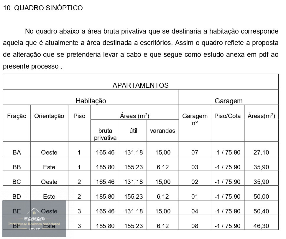 As estruturas já executadas permitem sem grandes percalços adaptar o volume do edifício, as (ABP) áreas brutas privativas das frações destinadas a escritórios variam entre os 165.46m2 e os 185.80m2 pelas áreas o fato dos espaços interiores se encontrarem em bruto permitem adaptar com alguma facilidade os espaços de escritórios em habitações tipologia T3.
